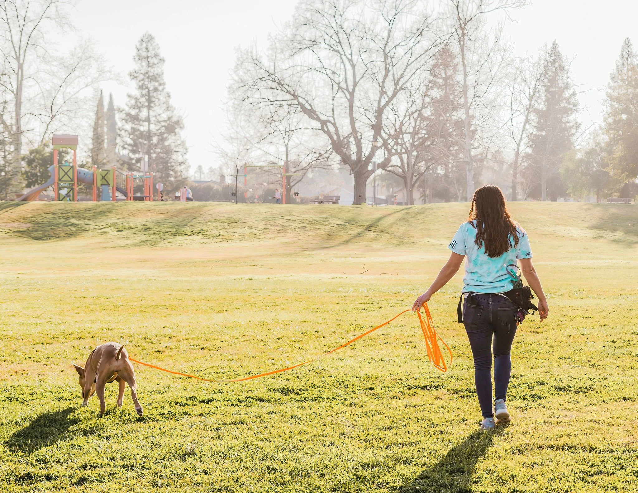 Now, the second part of “Make it Happen” is setting your dog up for success! That might sound a little preachy, but it truly just means, practice in environments that your dog can perform the task. You probably didn’t learn to drive on the freeway, right? Instead you were more likely to start in the driveway or a parking lot - somewhere far away from other drivers and stop lights. Only after demonstrating that you knew which pedals were which and could safely turn, did you likely venture onto a calm street. This scaffolded style learning helps to keep you and the other drivers safe. Now for your dog, this scaffolding should have a similar idea, except instead of handing him the car keys, we’re going to utilize a long lead. You must first start with teaching your dog the cue in a space where they’re calm and comfortable. If Precious won’t come to you from the other side of the kitchen, she’s definitely not coming to you from the other side of the street, or from the other side of the park. Start simple. Work inside your home, then in your yard, then when you’re out of sight inside your home, then on your walks in the neighborhood, then take it to the long line. So what’s a long line? It’s also called a long lead, training lead, lunge line, check chord, hunting lead, tracking lead or the most simple, rope. Essentially, it’s a leash that measures in length anywhere from 10’ to 50’. In general, I recommend sticking within the 15’-25’ range. More than 25’ becomes a lot of lead to handle. The long line is meant to give your dog a safe amount of freedom while allowing you to practice working on their recall.